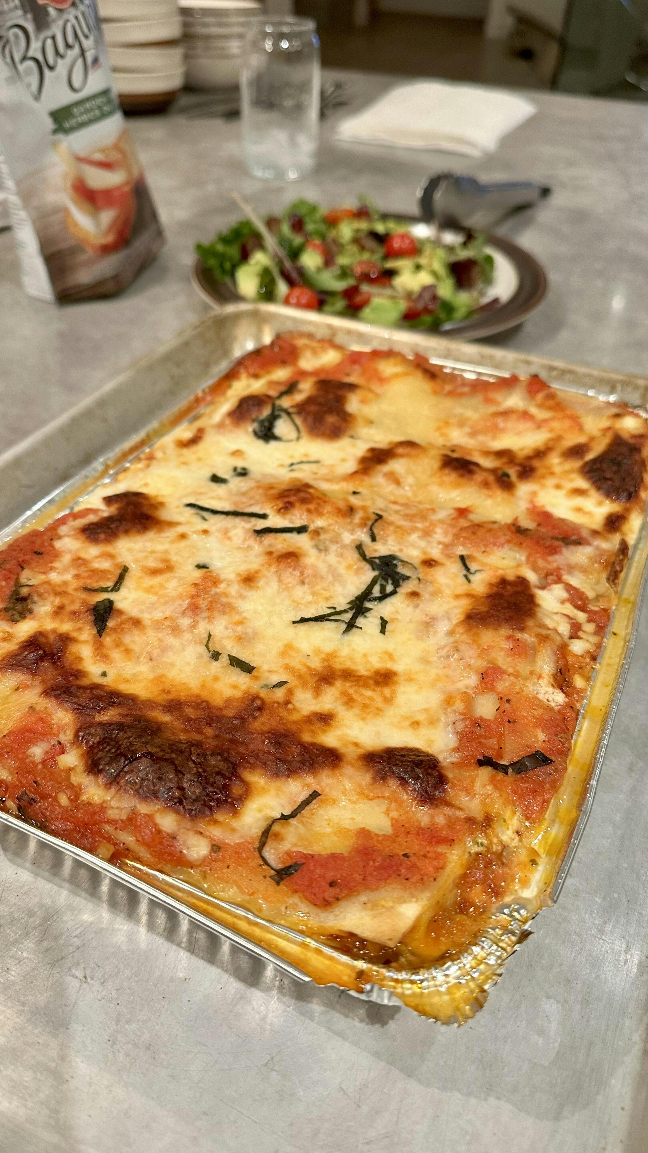 It has layers of fresh pasta, breaded chicken cutlets, Buffalo sauce, homemade tomato sauce, Gorgonzola, ricotta, provolone, mozzarella, and Romano cheese.