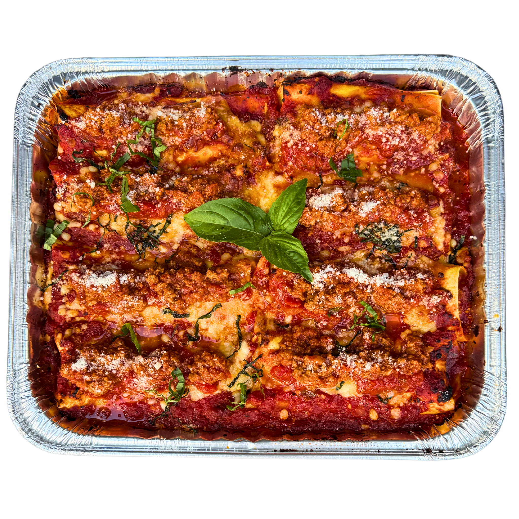 It has rolls of fresh pasta, slow cooked beef & pork ragu, creamy ricotta, provolone, mozzarella and pecorino Romano!