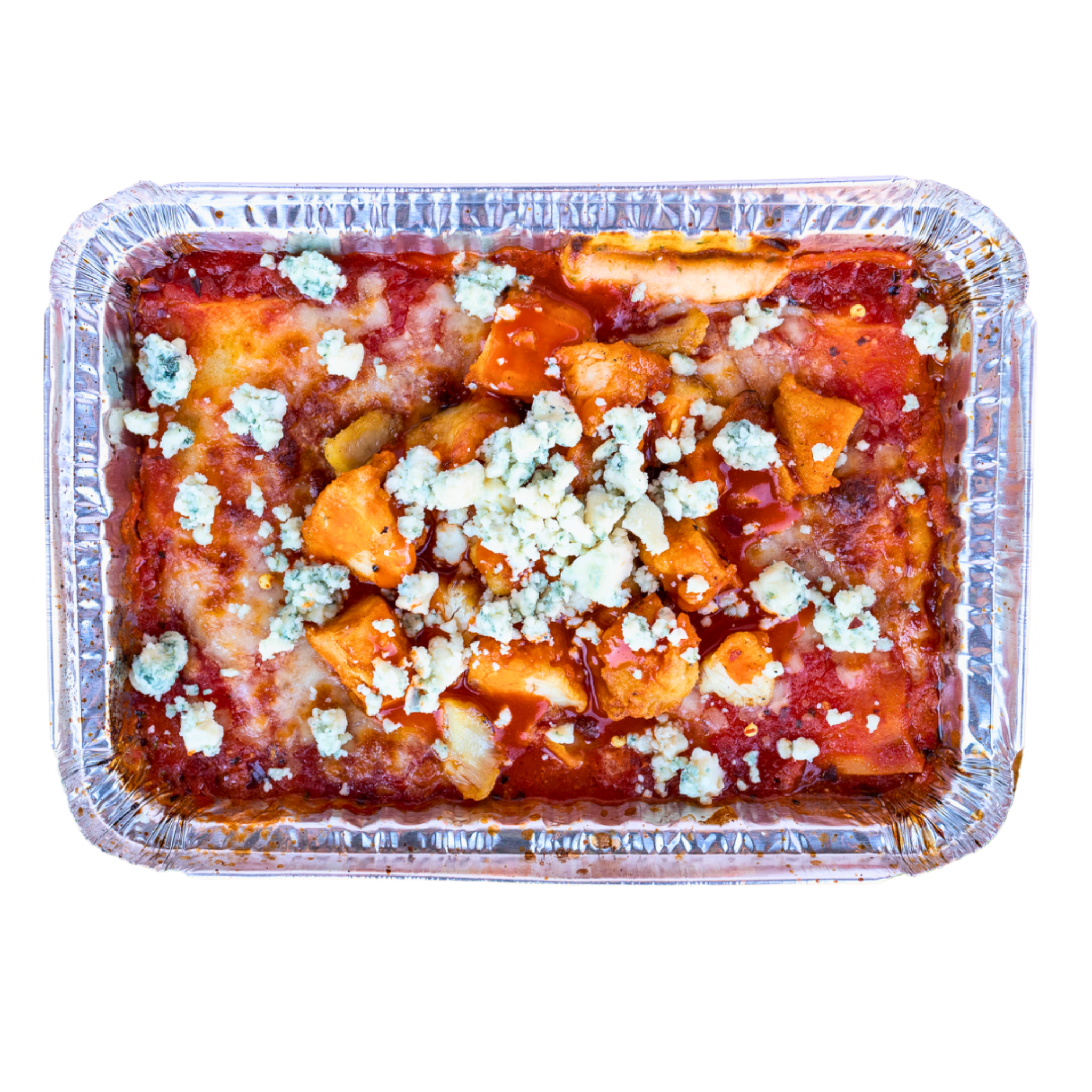 It has layers of fresh pasta, breaded chicken cutlets, Buffalo sauce, homemade tomato sauce, Gorgonzola, ricotta, provolone, mozzarella, and Romano cheese.