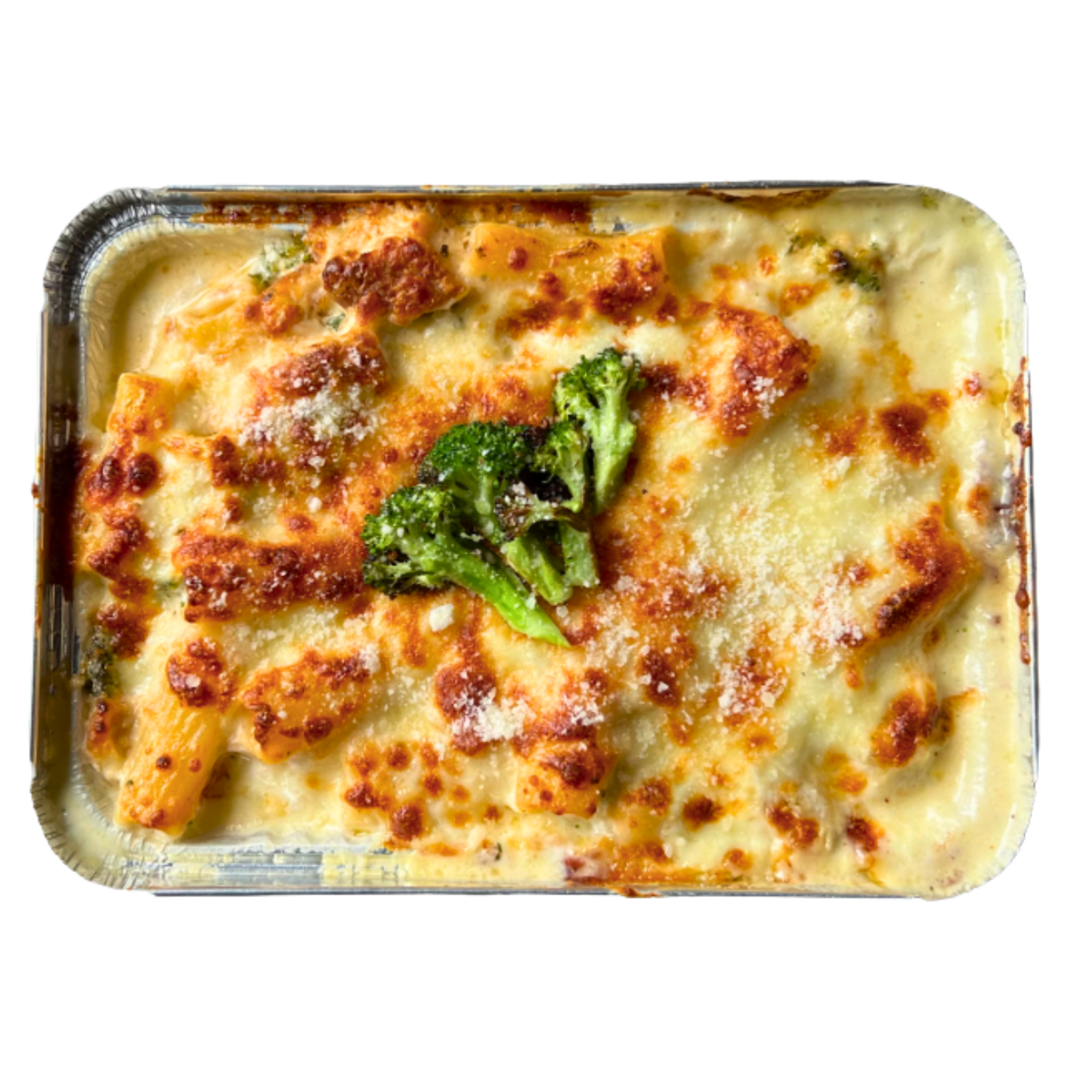 It has layers of fried chicken cutlets, white garlic cream sauce, roasted broccoli florets, ricotta, provolone, mozzarella, and Romano cheese and perfectly cooked ziti.