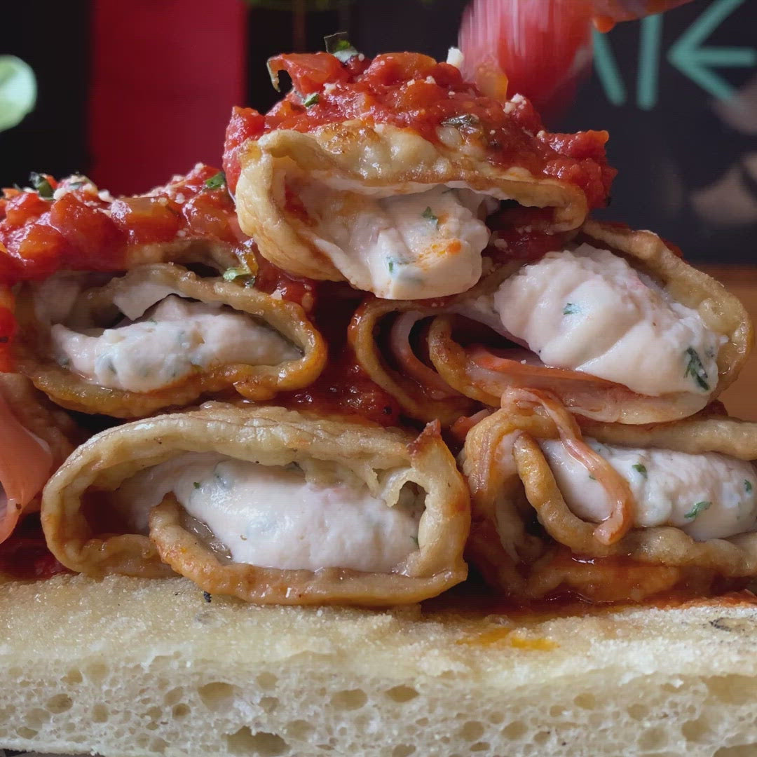 Then we fry to a nice golden brown and stuff it with ricotta, provolone, mortadella and pecorino Romano.